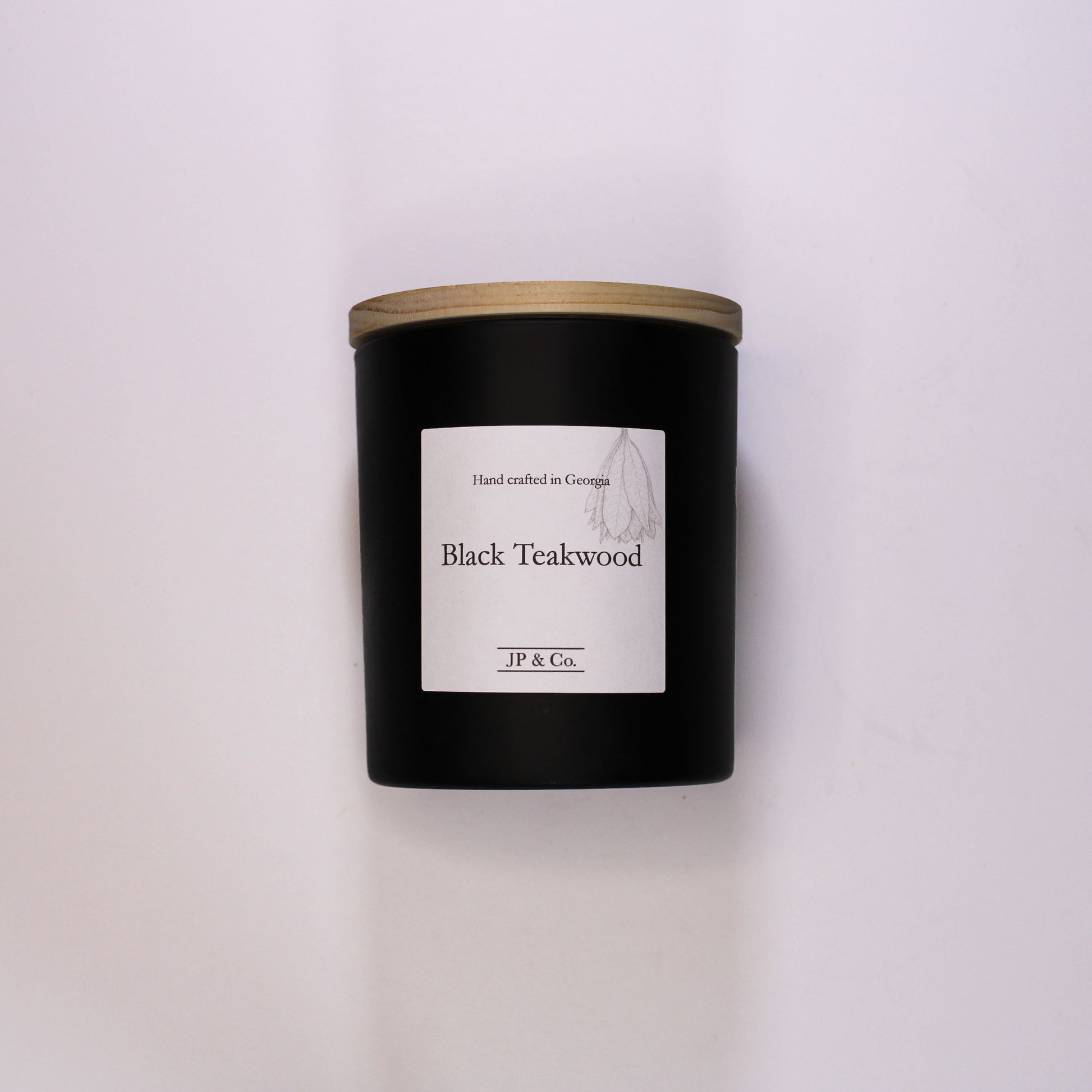 JP & Co.'s Black Teakwood candle is made with notes of Peppercorn, Tobacco Leaf, Teakwood, Sandalwood, Amber & Musk.
